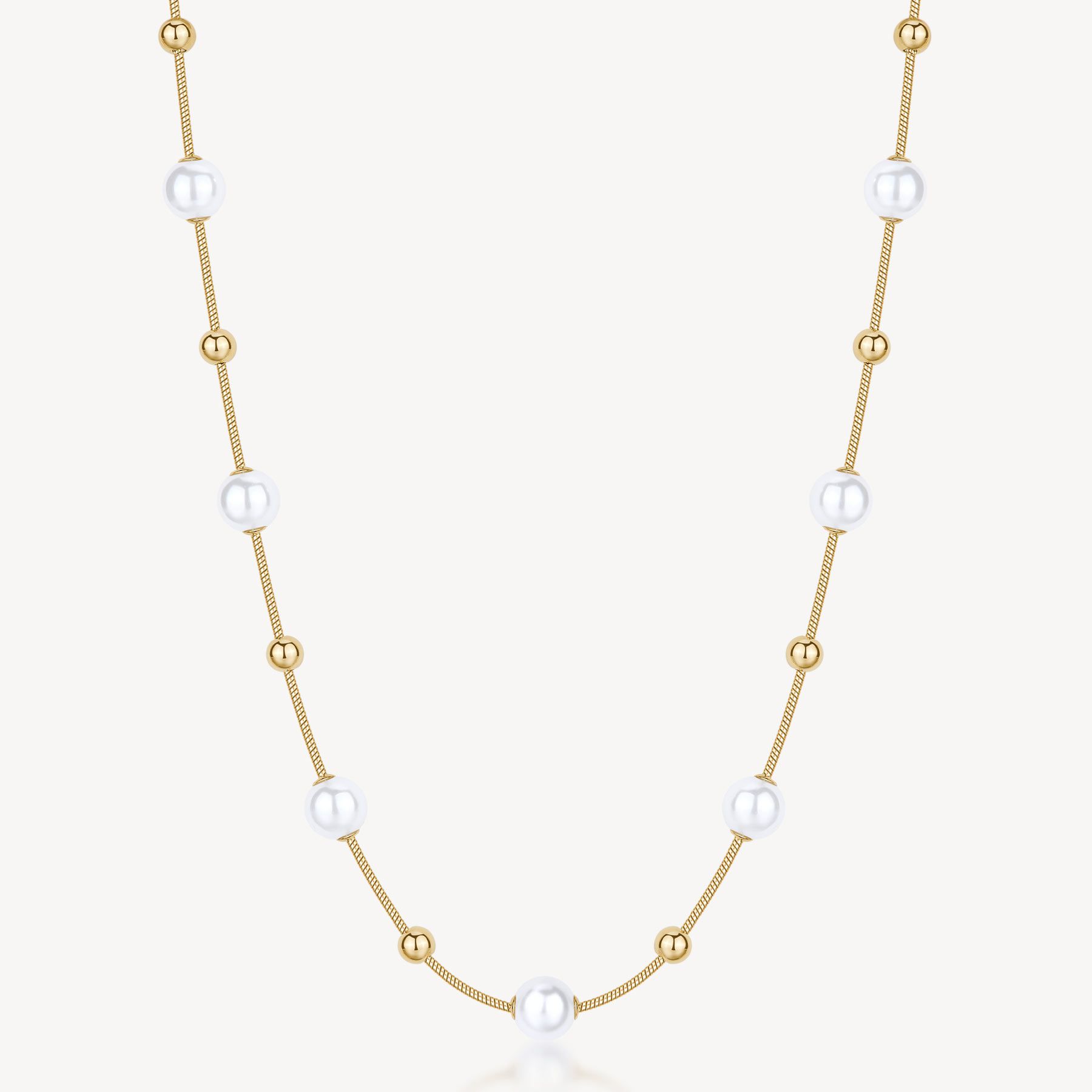 * Collana girocollo in acciaio 316L e finitura pvd oro 14K, con sfere e perle di conchiglia.
